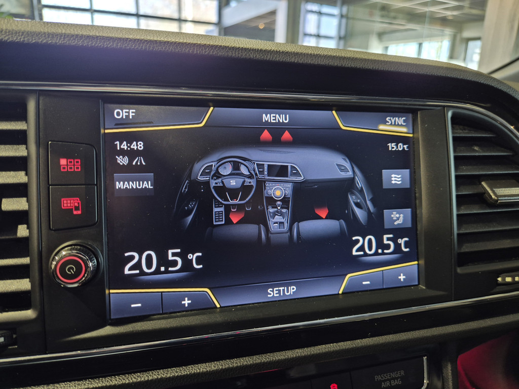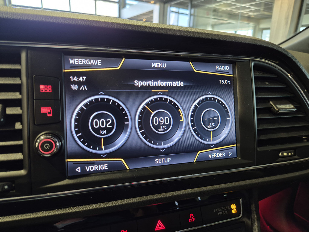Het digitale dashboard rekent mee, denkt mee en rijdt mee. Alle info overzichtelijk in beeld, overal. Ongelukken of parkeerschade? Dat gebeurt u niet meer, met de achteruitrijcamera. In deze Leon vindt u niet alleen schakelaars op het stuur om het audiosysteem te bedienen en het full map navigatiesysteem, maar er is ook spraakbediening. Ook is de auto voorzien van automatische airconditioning. Het luxeniveau in deze SEAT is niet alleen gericht op comfort, maar ook op uw veiligheid. Tal van sensoren helpen u om de omgeving in de gaten te houden. De automatisch inschakelbare verlichting zorgt dat automatisch de verlichting wordt ingeschakeld als het donker wordt, wat bijvoorbeeld in tunnels erg handig is. En de regensensor zet de ruitenwissers aan zonder dat u eraan hoeft te denken. En deze auto heeft ook schakelpaddles aan het stuur, cruise control, automatisch dimmende binnenspiegel, isofix-aansluiting, centrale deurvergrendeling met afstandsbediening en boordcomputer als standaard uitrusting.